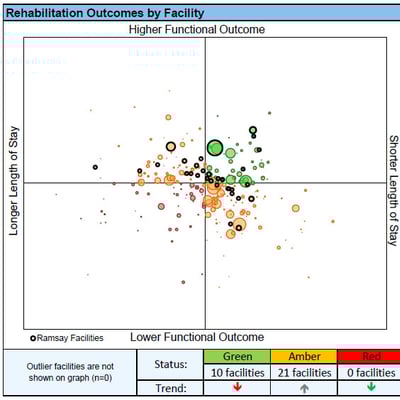 We aim to have all of our facilities in the top two quadrants, as they represent the achievement of higher functional outcomes. Ideally our facilities would achieve optimal functional outcomes with minimal hospitalisation. Facilities that achieve this are represented in the top right-hand quadrant and are coloured in green. Facilities that have lower than average functional outcomes and longer than average hospital stays are shown in red in the bottom left quadrant.